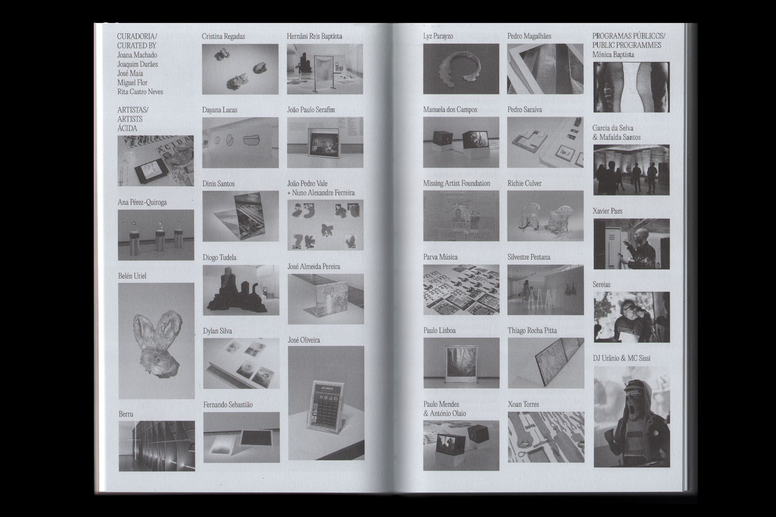 Publisher: Galeria Municipal do Porto / Ágora – Cultura e Desporto, E.M. / Comissioned by: Guilherme Blanc, João Ribas / Contributions: Ana Resende, Andreia Garcia, Catarina Miranda, Eduarda Neves, Filipa Ramos, Filipe Marques, Guilherme Blanc, Joana Machado, João Ribas, Joaquim Durães, José Maia, Melissa Rodrigues, Miguel Flor, Pedro Augusto, Pedro Magalhães, Rita Castro Neves, Samuel Silva, Simão Bolívar / Photography:Dinis Santos, Renato Cruz Santos / Editorial Coordination: Patrícia Coelho, Tiago Dias dos Santos / Print: Gráfica Diário do Porto